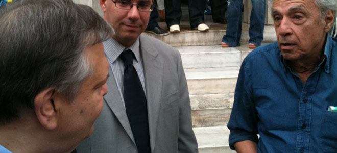 Ένα αναπάντεχο τετ- α-τετ είχε πριν από λίγη ώρα στην Βουλή ο Αντιπρόεδρος της Κυβέρνησης Ευάγγελος Βενιζέλος. Μπροστά του στην είσοδο των Υπουργικών εμφανίστηκε ο γνωστός σκηνοθέτης Κολλάτος, ο οποίος είναι εκ των πρωταγωνιστών του κινήματος των Αγανακτισμένων. Από το πρωί, ο κ. Βενιζέλος μέσω Twitter, είχε καλέσει τους Αγανακτισμένους σε συνάντηση στο γραφείο του, προκειμένου να συζητήσουν όλα τα θέματα «σοβαρά». Ο κ. Κολλάτος είπε στον κ. Βενιζέλο ότι θέλουν να συζητήσουν και ο Αντιπρόεδρος του απάντησε ότι