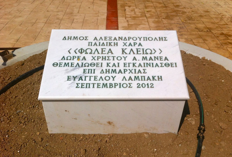 Ήδη χθες το πρωί (20/9/2012) στο χώρο είχε τοποθετηθεί η πλάκα στην οποία αναφέρεται ο δωρητής και το νέο όνομα της παιδικής χαράς.