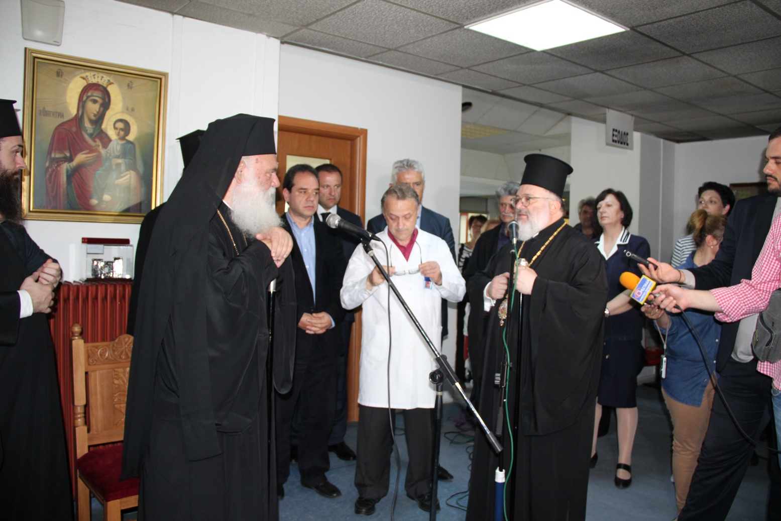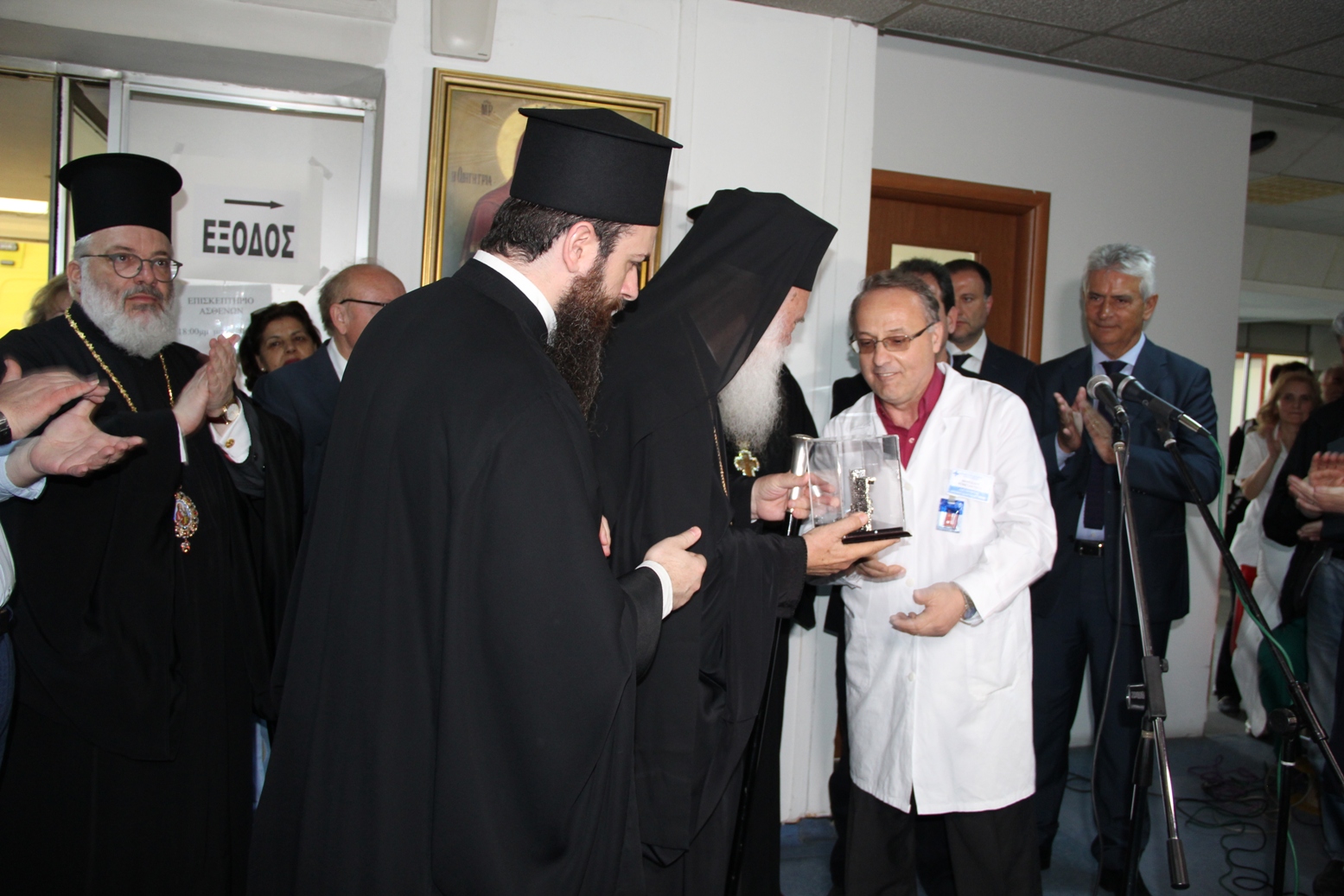 Μετά από μία σύντομη δεξίωση στο Πνευματικό Κέντρο του Καθεδρικού Ναού και ξενάγηση στο Εκκλησιαστικό Μουσείο ο Μακαριώτατος μετέβη στο Νοσοκομείο της πόλεως, όπου παρέδωσε υγειονομικό υλικό στον Προϊστάμενο της Ιατρικής Υπηρεσίας κ. Κωσταντίνο Βαφειάδη, επί παρουσία του Γενικού Διευθυντού της Μ.Κ.Ο. «Αποστολή» Κωνσταντίνο Δήμτσα, η οποία στηρίζει όλα αυτά τα χρόνια πρόθυμα το προνοιακό κοινωνικό έργο της Ιεράς Μητροπόλεως.